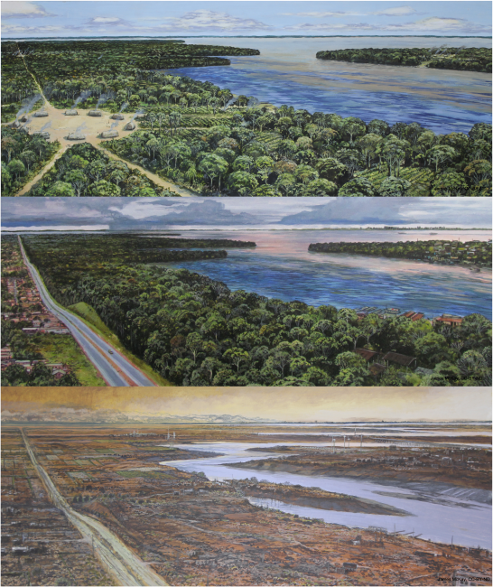 На верхнем рисунке изображено традиционное поселение коренных народов Амазонии до их контакта с цивилизацией (примерно 1500 год нашей эры) — поселение, имеющее выход к реке и окруженное тропическим лесом, где люди выращивали различные культуры. На среднем рисунке — современный ландшафт. Нижний рисунок относится примерно к 2500 году, и на нем изображена пустынная местность и река с очень низким уровнем воды в ней, что является результатом вырубки леса. Инфраструктура скудная или пришедшая в упадок, а деятельность человека минимальна.
