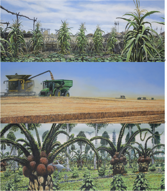 Изображение на верхнем рисунке основано на данных о городах и поселениях коренных народов до колонизации: сельское хозяйство характеризовалось многообразием и было основано на выращивании кукурузы. Второй рисунок — это тот же район сегодня, и для него характерно выращивание одной культуры с использованием крупной сельскохозяйственной техники. На последнем рисунке изображен результат адаптации к жаркому и влажному субтропическому климату: акцент сделан на выращивании масличных пальм и суккулентов аридных зон. За плантациями ухаживают беспилотники, оснащенные искусственным интеллектом, и присутствие человека минимально.