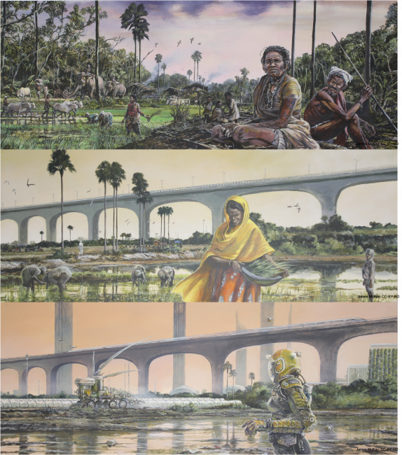 На верхнем рисунке изображена сцена из жизни оживленной аграрной деревни — сцена посадки риса, ухода за домашним скотом и взаимодействия между людьми. На среднем рисунке — сцена из современной жизни, изображающая смесь традиционных методов выращивания риса и проявлений современной инфраструктуры, присутствующей во многих районах Глобального Юга. На нижнем рисунке изображено будущее технологий приспособления к высоким температурам — в том числе роботизированное сельское хозяйство и зеленое домостроение с минимальным присутствием человека, что обусловлено потребностью в индивидуальных защитных средствах.