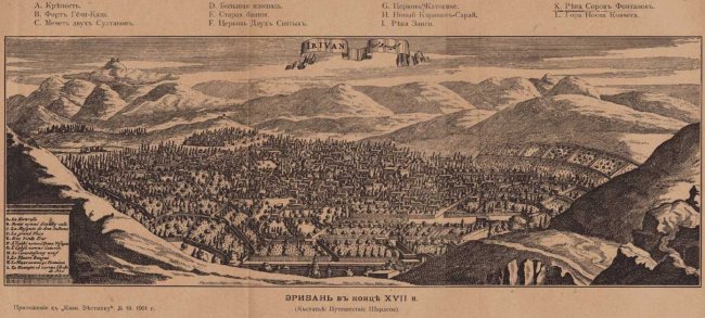 По мнению армян, Эривань — самое древнее поселение в мире, так как, по их преданиям, там жил Ной со всем своим семейством, как до потопа, так и после,— сойдя с горы, на которой остановился ковчег; кроме того, армяне утверждают, что именно здесь-то и был земной рай. Конечно, эти предания маловероятны и передаются людьми невежественными и спесивыми. Некоторые писатели говорят, что Эривань — тот самый город, который Птоломей называет Терва и считает столицей Армении. Другие полагают, что это царственный Артаксат. В турецкой истории он носить название Еритце. В армянских летописях, находящихся в знаменитом монастыре трех церквей, говорится, что этот город прежде назывался Вагар-Шапат, что в нем цари содержали свой двор, что город был построен одним из первых князей страны по имени Вагар и что поэтому он и назывался Вагар-Шапат, что значит в буквальном переводе город Вагара. Но эти же самые летописи не заслуживают полного доверия на том основании, что, указывая на происхождение названия города Эривань от армянского глагола, означающего видеть, они утверждают, будто такое название дано городу потому, что Ной, спускаясь с горы Арарат, увидел эту землю первою. Однако, кто же не знает, что армянский язык — новейший и не был известен 700 лет тому назад. В персидской истории нет никаких указаний о происхождении названия Эривани. Что же касается моего мнения, то мне кажется, что этот город был воздвигнут не раньше совершенных арабами в Армении завоеваний. Я думаю так на том основании, что ни в самом городе, ни в окрестностях его нет никаких следов особенной древности. Турки овладели Эриванью в 1582 году и построили там крепость. Персы ее взяли в 1604 году и укрепили так, чтобы она могла выдержать любую канонаду. В 1615 году она выдержала четырехмесячную осаду. Окружающий ее вал, несмотря на то, что он был только земляной, устоял перед турецкой батареей и турки принуждены были отступить. Они возвратились после смерти Великого Абаса и овладели городом; но не надолго. Сефи взял его обратно в 1635 году и после этого оне уже более осаде не подвергался.