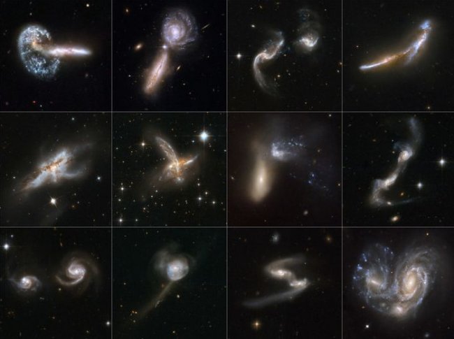 Взаимодействующие галактики. Учебники по астрономии обычно представляют галактики как одинокие и величественные миры сверкающих звезд. Но галактики могут быть расположенные в пространстве достаточно близко, чтобы взаимная гравитация существенно влияла на форму, движение, процессы звездообразования, а в некоторых случаях и на обмен веществами между ними. Снимки 2008 года.