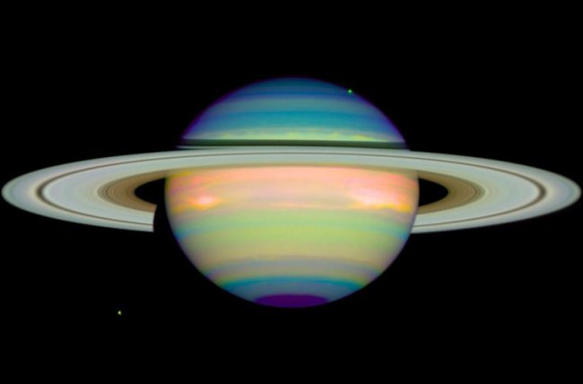 Инфракрасный Сатурн. Изображение получено 4 января 1998 года и показывает отраженный инфракрасный свет планеты, что дает подробную информацию о облаках и дымке в атмосфере Сатурна.