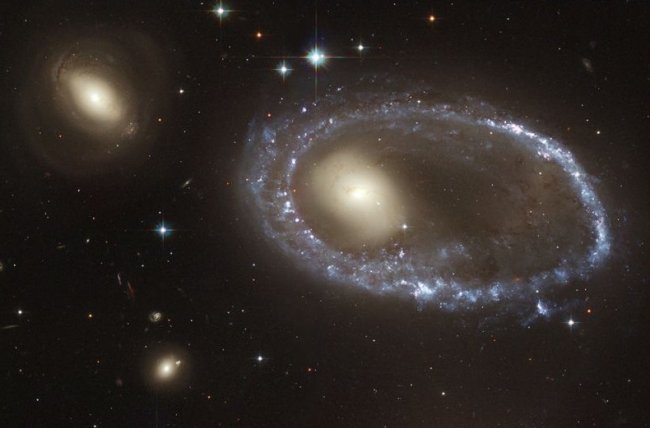 Кольцо голубых звезд вокруг галактики AM 0644-741. Предполагается, что кольцо образовалось при столкновении с другой галактикой, при этом вследствие гравитационного разрушения пыль в галактике уплотняется и образует звезды. 2004 год.