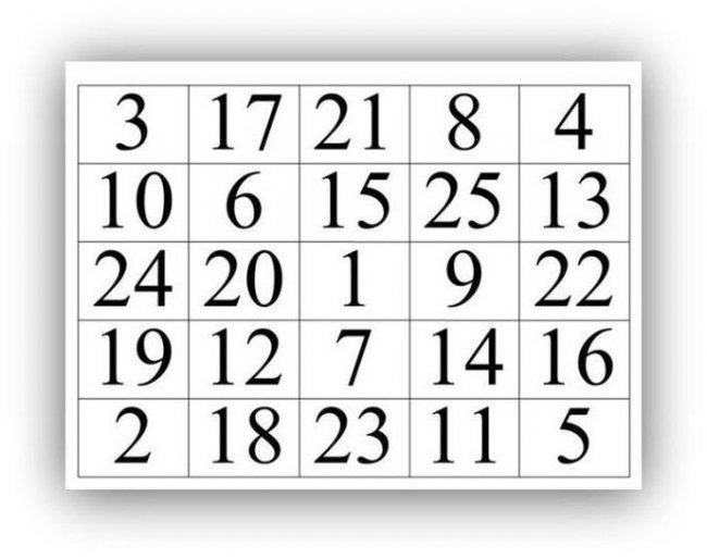 Стараться быстро находить цифры. Делать это нужно беззвучным счетом. Иными словами про себя и в возрастающем порядке, начиная от 1 и до 25, не пропуская ни одно число. Найденные цифры и числа нужно обозначать лишь взглядом. Результатом такой тренировки должно быть время не больше 25 секунд.