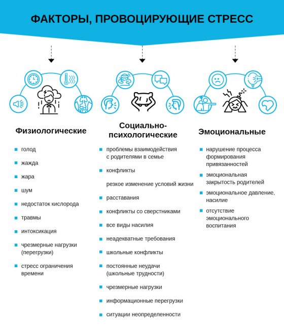Проблемы взаимодействия в семье, конфликты, все виды насилия, постоянные неудачи, ситуации неопределенности, неадекватные требования, информационные перегрузки...