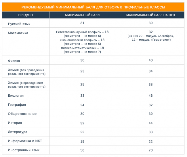 Ориентиром при отборе в эти классы могут стать показатели, примеры нижних границ которых соответствуют минимальным баллам, указанным в таблице.