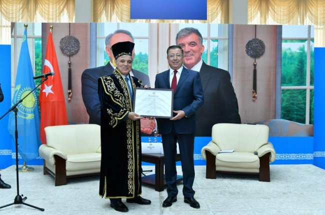 В знак благодарности Жансеит Туймебаев вручил высокому гостю Золотую медаль Аль-Фараби. Также известному политику присвоено звание «Почетный профессор» Казахского национального университета имени Аль-Фараби.